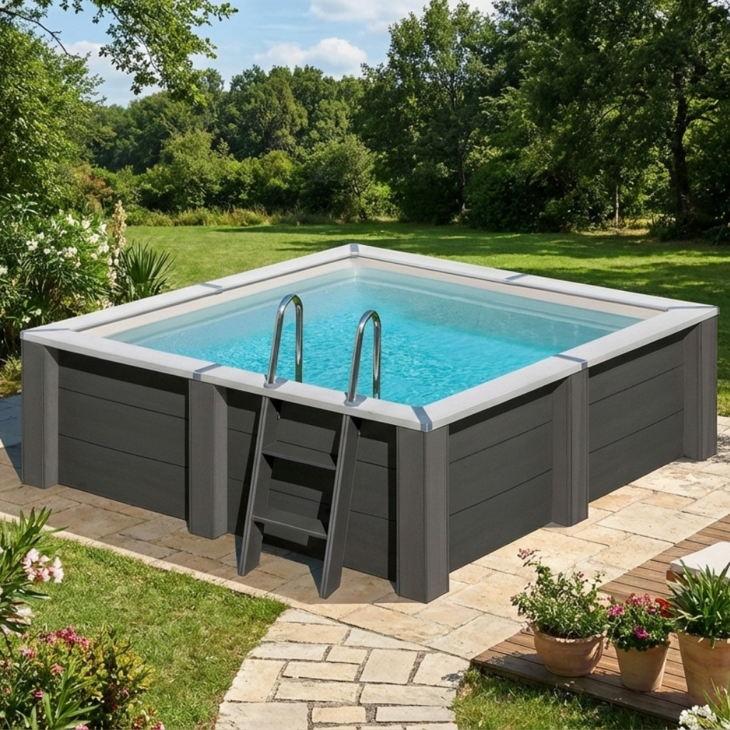Ściany basenu wykonane są ze zbrojonych paneli kompozytowych, łączonych profilami ze szczotkowanego aluminium. Dno oraz boki wyłożone są odporną na promieniowanie UV folią PVC o grubości 0,6 mm. Całość uzupełniają wykończenia aluminiowe, drabinka ze stali nierdzewnej oraz kompozytowe schodki zewnętrzne.