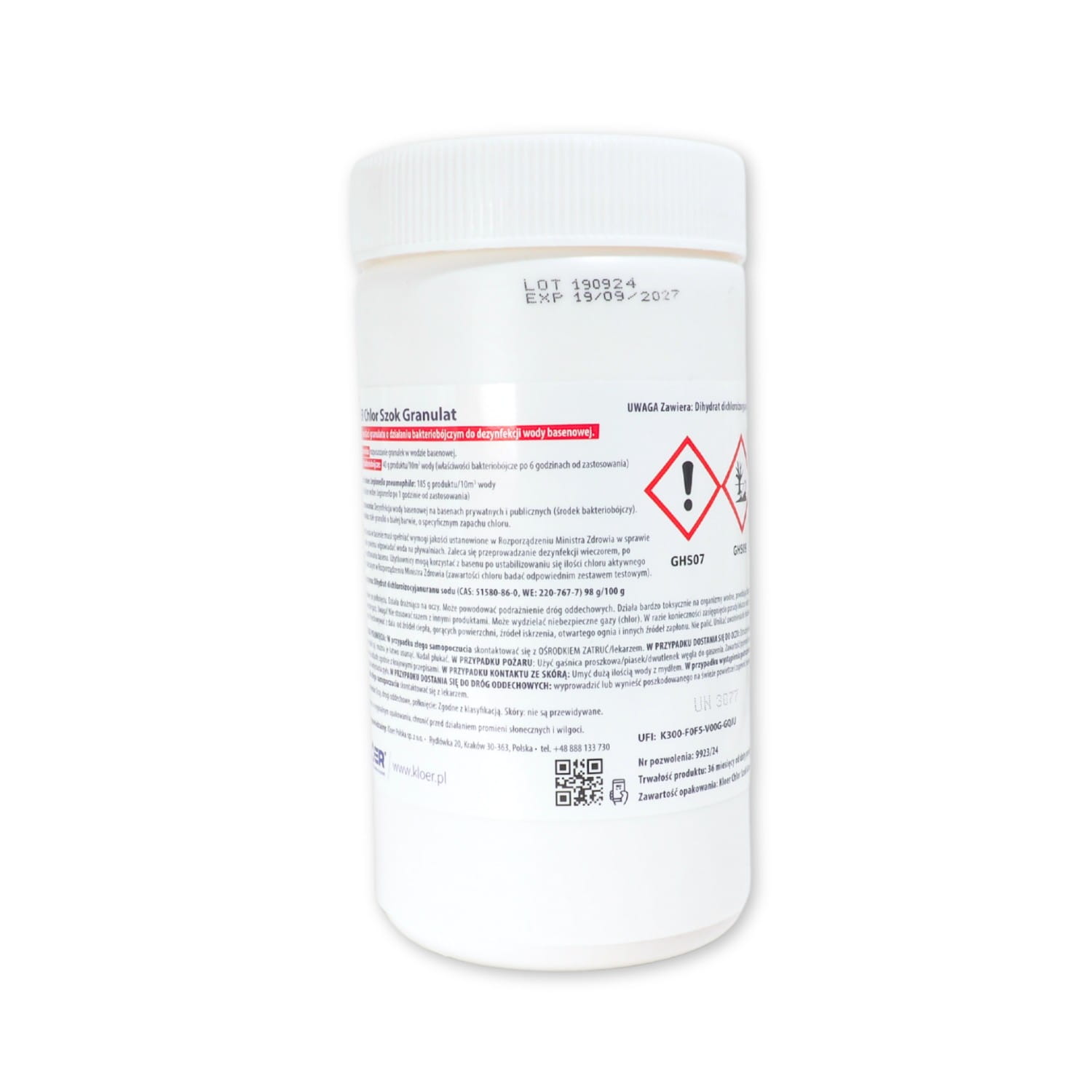 Produkt zawiera: Dihydrat dichloroizocyjanuranu sodu (CAS: 51580-86-0, WE: 220-767-7) 98/100g