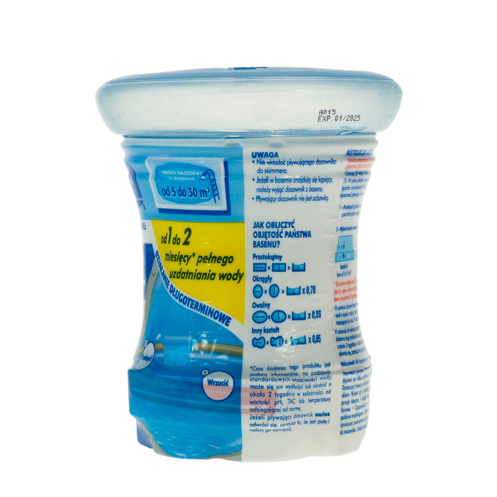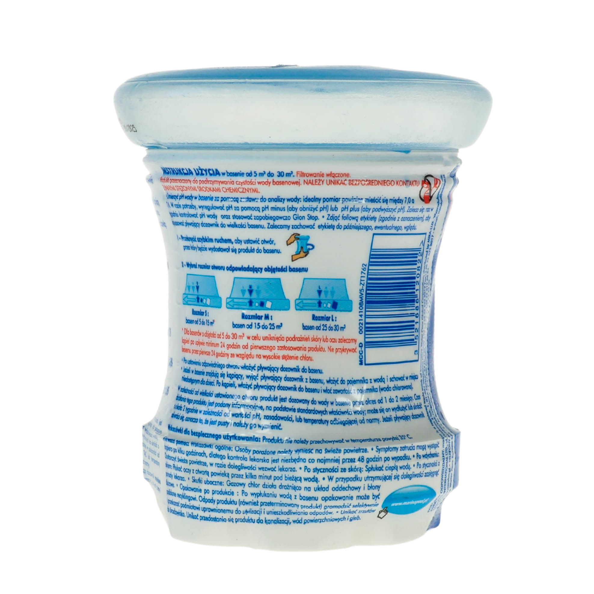 Czas działania tego produktu jest podany informacyjnie, na podstawie standardowych właściwości wody; może się on wydłużyć lub skrócić o około 2 tygodnie w zależności od wartości pH, zasadowości, lub temperatury odbiegającej od normy. Jeżeli pływający dozownik odwróci się, oznacza to, że jest pusty i należy go wymienić.