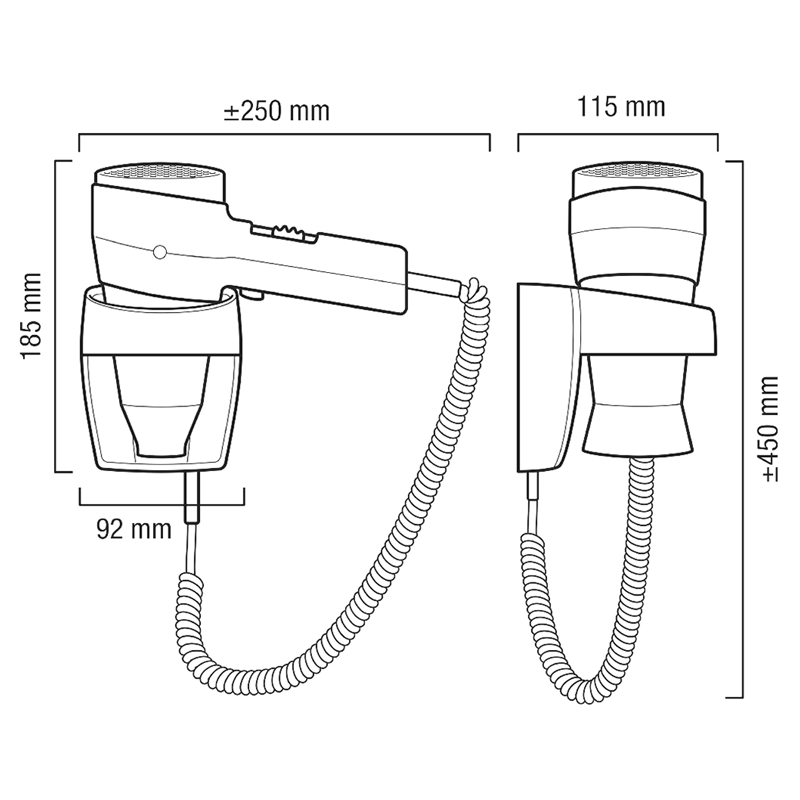- Wymiary suszarki: Wysokość 185 mm (wysokość wraz z wężem 450 mm), szerokość 250 mm, głębokość 115 mm